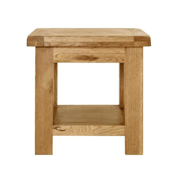 Featuring a simple design with one shelf, this fully assembled lamp table is crafted with knotty oak, oak veneer and pine with a hand waxed and gently distressed finish.