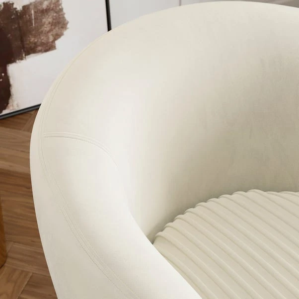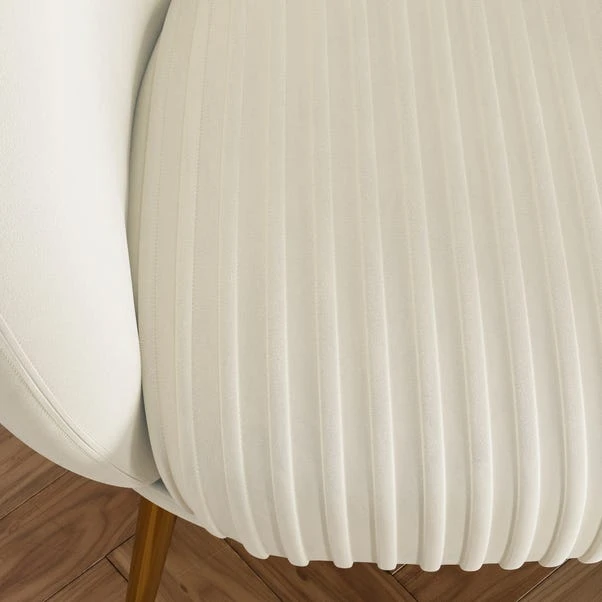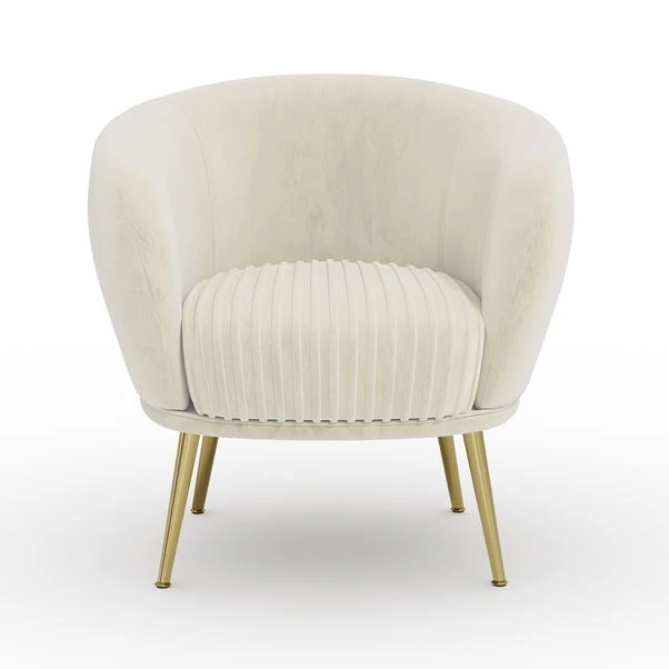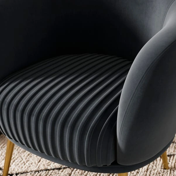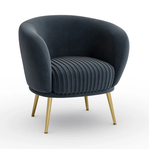 With its curved silhouette complete with a scalloped, shell back design, this stunning armchair offers a glamorous, art deco inspired design and would be the perfect statement piece for your home. This part assembly chair features a foam-filled seat and backrest to provide luxurious comfort and comes complete with stunning gold-coloured metal legs. This elegant armchair is upholstered in a smooth velvet fabric and finished in a choice of stunning colourways.