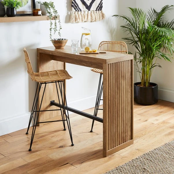 Elevate your dining experience with this bar table set! Handmade from natural rattan and sleek black metal, these bar stools offer a stylish and comfortable seating option for your home. The accompanying Bryant Bar Table is perfect for summer parties and al fresco dining, featuring a mango wood effect finish, sturdy metal footrest, and panelled sides. This set seats up to two people and is sure to impress your guests with its chic and modern look.