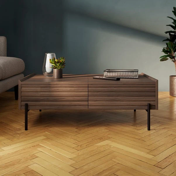 Experience a masterpiece of practicality and style with the Bryant Coffee Table, meticulously crafted to meet your storage needs and the perfect addition to any modern living space. With its sleek sliding top panels, you can easily access the large storage space within, making it the perfect solution for those who value convenience. The soft close mechanism ensures a smooth and gentle closure, so you can store your belongings without any hassle and the sleek metal legs provide a perfect contrast with the warm wood effect finish, creating a striking look that adds to the overall aesthetic appeal.