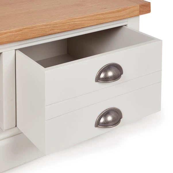 Inspired by clean and simplistic styling with a natural look that will complement a host of interiors, the charming Compton range features natural solid oak and oak veneer tops accompanied with an elegant Ivory painted finish. Crafted with classic antique silver cup handles, this range is designed with sturdy pine plinth base.