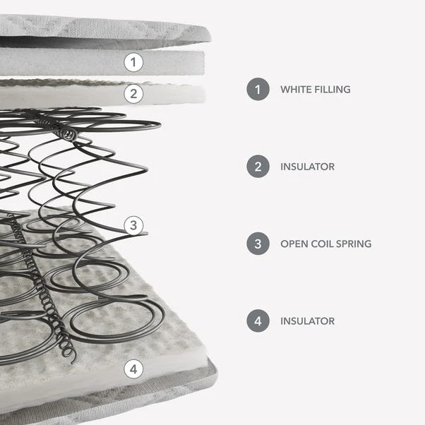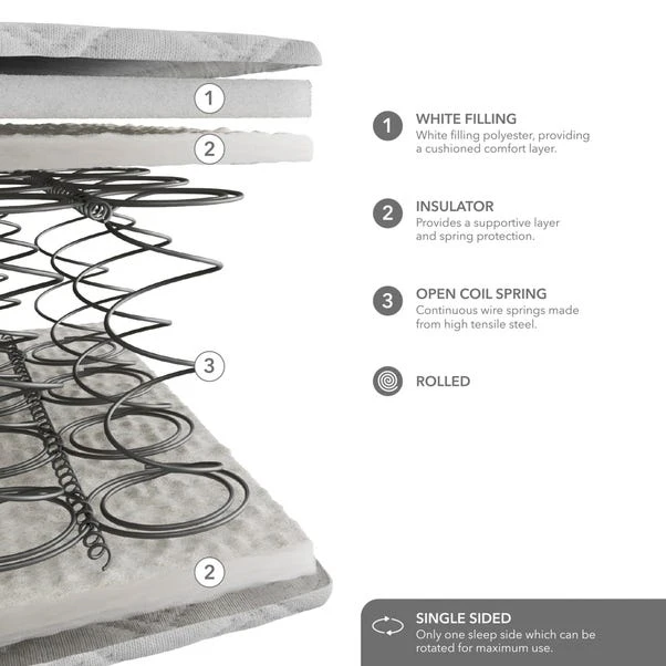 Elevate your sleep experience with the Dunelm Rolled Open Coil Mattress, a masterpiece in comfort innovation. Featuring an open coil Bonell spring, this single-sided marvel ensures a restful night’s sleep with its cleverly quilted top that adds an extra layer of sumptuousness. Worried about navigating tight spaces? Fear not, for this mattress is expertly rolled, providing seamless access to any room of your choosing. The spring insulator pad and additional comfort layer ensure you’ll feel nothing but pure comfort – no more unwelcome encounters with springs. Breathe easy with its breathable fillings, a thoughtful touch that adds to the overall allure of this sleep haven.