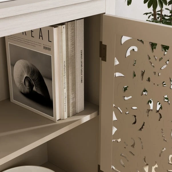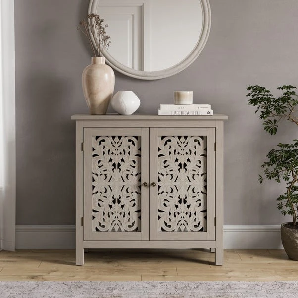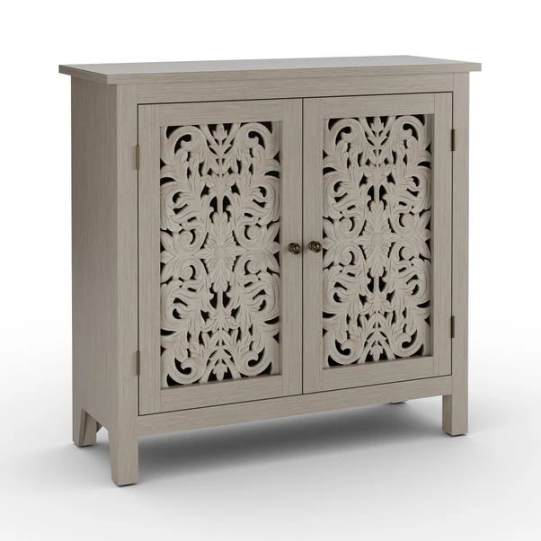 Add timeless charm to your home with the Eden Small Sideboard, featuring intricately carved door detailing and an antique whitewash finish. This beautifully crafted piece offers a blend of style and practicality, with adjustable internal shelves to suit your storage needs. Perfect for smaller spaces, it provides ample room to keep your belongings organised while adding an elegant touch to your décor.