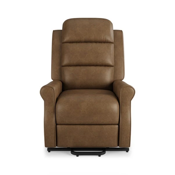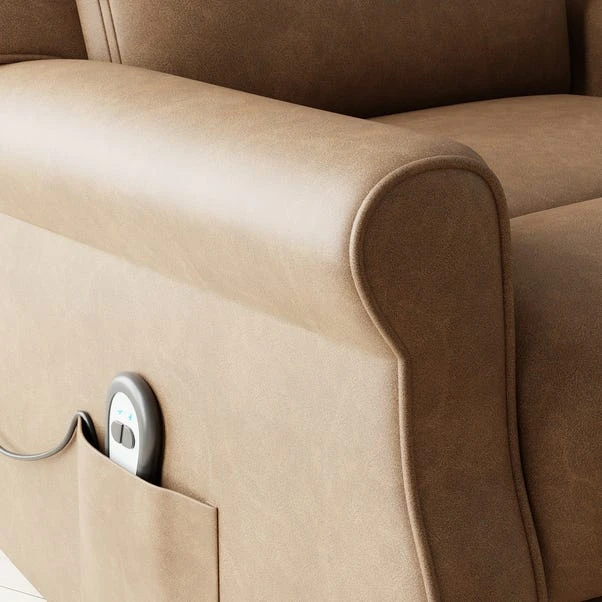 This comfortable armchair brings together elements of style, comfort and functionality to create a sanctuary of tranquillity into your living space. Experience the ultimate relaxation with our Rise & Recline feature. This innovative mechanism allows you to effortlessly adjust the chair’s position to find the perfect angle for your comfort. Whether you want to sit upright and read a book or recline and take a nap, the choice is yours at the touch of a button. The brown faux leather upholstery not only offers a stunning visual appeal but also provides a smooth and supple texture that adds a touch of opulence to your living space. Supreme comfort awaits as you sink into the plush cushioning of this armchair. The foam filled cushions not only provide a luxurious feel but also offer exceptional durability and the rolled arms add a classic and elegant touch which elevates the overall aesthetic of the chair.