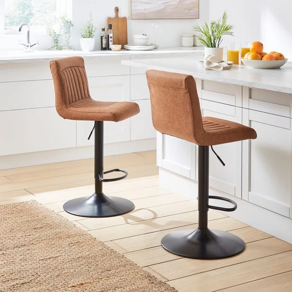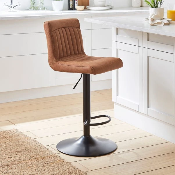 Finished in a stylish faux leather fabric, this modern Felix Bar Stool is perfect for adding a contemporary touch to any kitchen dining space. Featuring a comfortable foam padded seat, with an easy to use gas lift mechanism and full 360-degree swivel functionality making it easy to adjust the stool to suit your needs. This self-assembly bar stool comes complete with a sturdy black metal base as well as ribbed stitched detailing to complete the look.