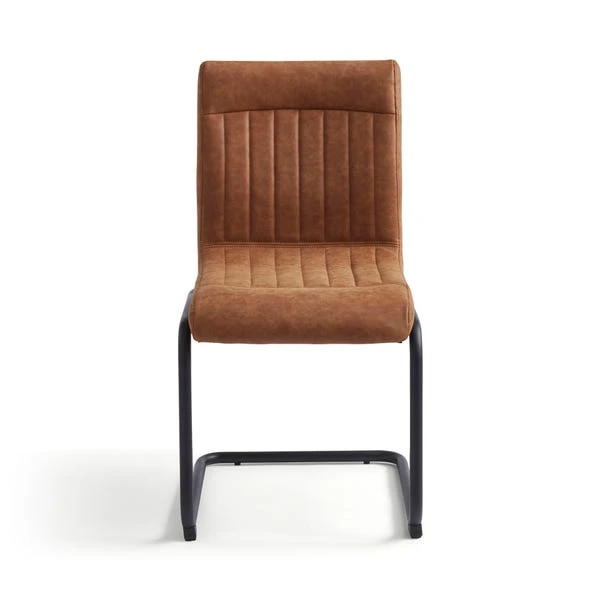 Featuring a modern design with a retro industrial finish, this stylish pair of dining chairs require minimal assembly and are built on sturdy black metal legs for a perfect contrasting look. Upholstered in a stylish faux leather and complete with gorgeous ribbed stitch detailing. These dining chairs feature deep foam padded seats for maximum comfort, perfect for any dining table space.