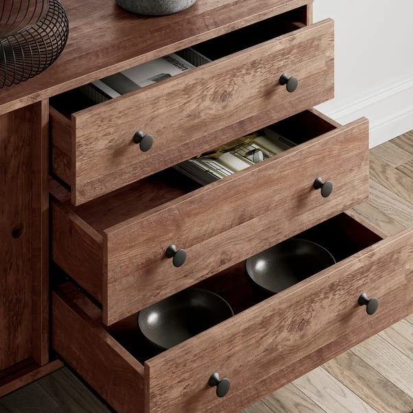 This sideboard is more than just a functional storage solution, its a statement piece that will instantly elevate the aesthetic of any room. This sideboard boasts a generous width, providing ample space to store and organise your belongings. With three spacious drawers and three shelves concealed behind stylish doors, you’ll have plenty of room to neatly stow away your essentials while keeping them easily accessible. The black metal leg frames add a touch of sophistication and modernity to the sideboard, creating a striking contrast against the warm wood pine effect finish. The combination of the sleek metal and the natural wood effect brings a harmonious balance to the overall design, making it a versatile addition to any interior decor. Designed to impress, this sideboard is not only a functional storage solution but also a captivating focal point in your living space. Its contemporary charm and simplistic allure make it a perfect fit for both modern and transitional interiors, effortlessly enhancing the overall ambiance of your home.