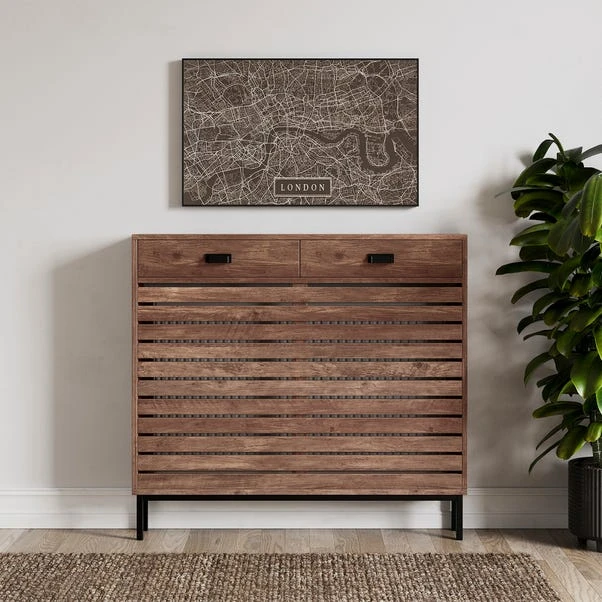 This Fulton Radiator Cover makes a stylish and practical addition to your space, featuring a slatted pine effect front. The Fulton radiator cover is also practical thanks to the two drawer panels on top for additional storage.
