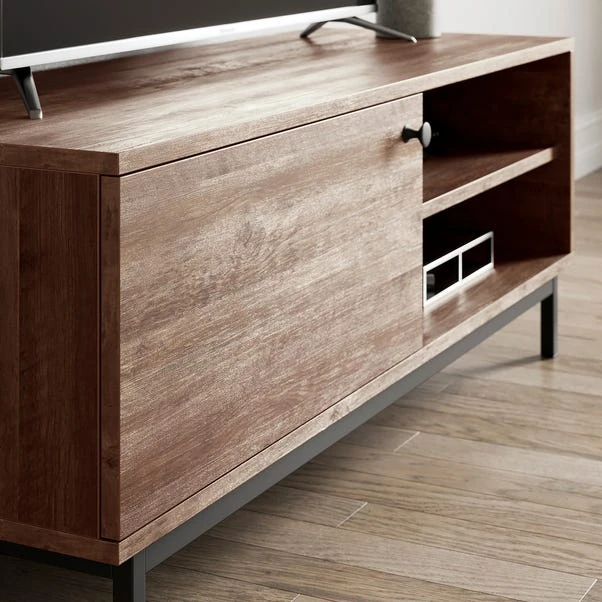 Designed with a spacious cupboard, equipped with a fixed shelf and adjustable hinged door, this stylish TV stand offers plenty of useful storage space. The two open shelves are perfect for games consoles and media devices, complete with access at the back for keeping your cables organised and out of sight.