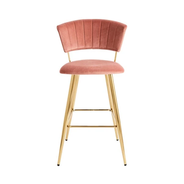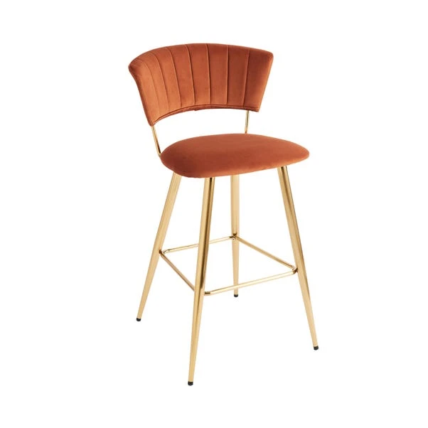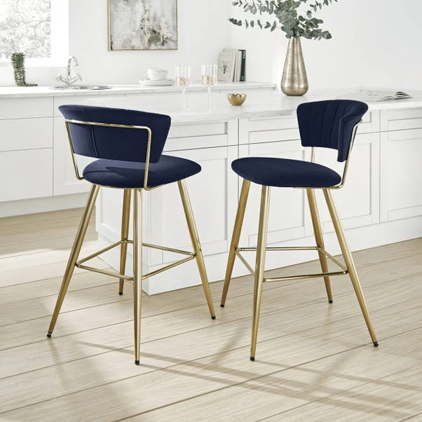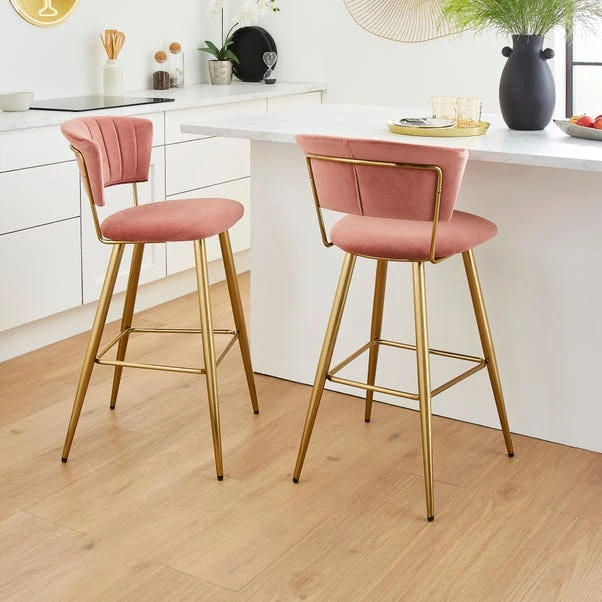 Finished in a plush velvet in a choice of stunning colours to match our Kendall chair, this bar stool boasts a contemporary luxe design. This stylish bar stool is crafted with a pleated, curved shell back and gold-finished metal legs to add a modern touch to your kitchen area.