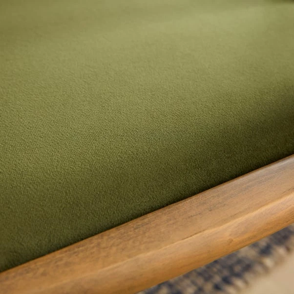 This dining chair offers a luxurious touch that will elevate your dining experience. The rich, deep olive velvet upholstery provides a sumptuous feel, adding a layer of sophistication to your space. The velvet’s plush texture makes this chair both inviting and indulgent, creating a warm and welcoming atmosphere for guests. The dark stained wooden frame offers a beautiful contrast to the velvet, ensuring the chair’s elegance is paired with long-lasting durability.