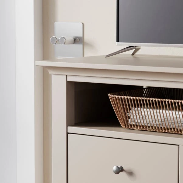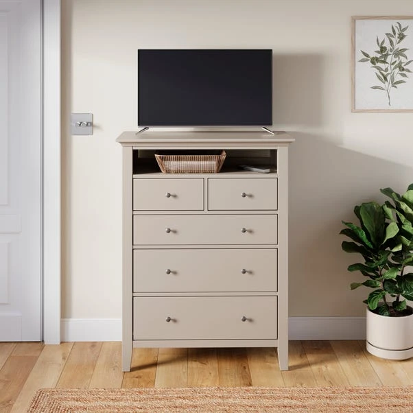 Designed with a sleek and modern look, this chest features five spacious drawers that provide ample room for clothing, accessories, or other essentials, helping to keep your space neat and organised. The addition of an open shelf offers a versatile display area, perfect for showcasing decorative items, storing books, or housing electronics such as a media box or speaker.