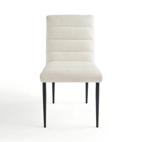 This dining chair, upholstered in a modern ivory boucle is designed to enhance your dining experience with its sophisticated look and plush seating. The soft boucle upholstery of this chair combines comfort and style with its elegant design. Its sturdy construction ensures durability, making it a practical choice for any home.