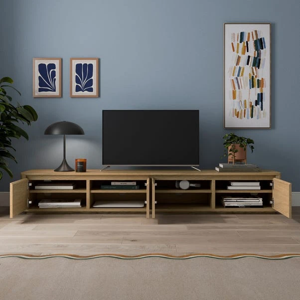 Designed with an ultra-wide format, this unit is perfect for larger TVs while offering ample surface area for additional décor or devices. Thoughtfully crafted, it features integrated cable management to keep wires neatly concealed, ensuring a clean and organised look. With extra storage compartments, this unit provides plenty of space for media equipment, games, or accessories.