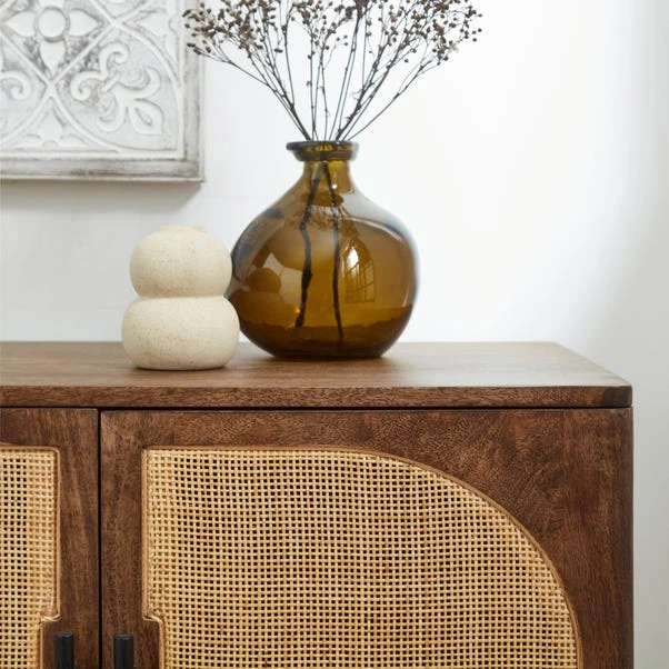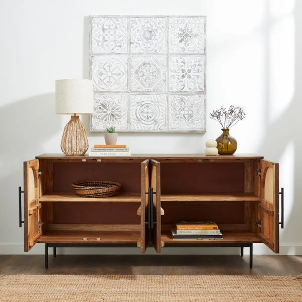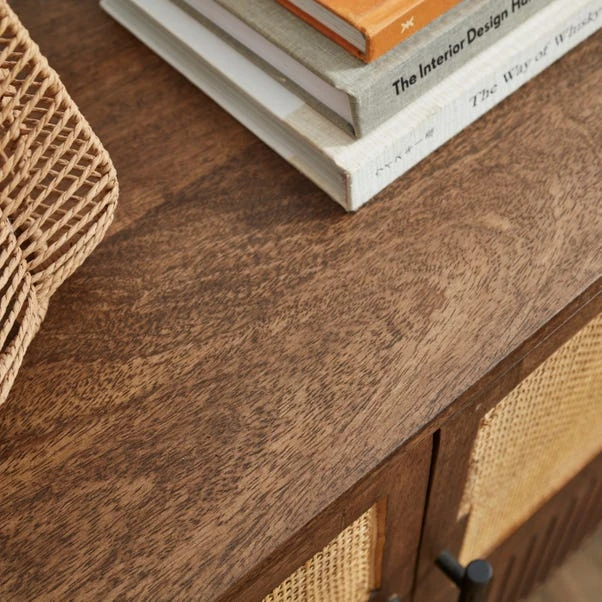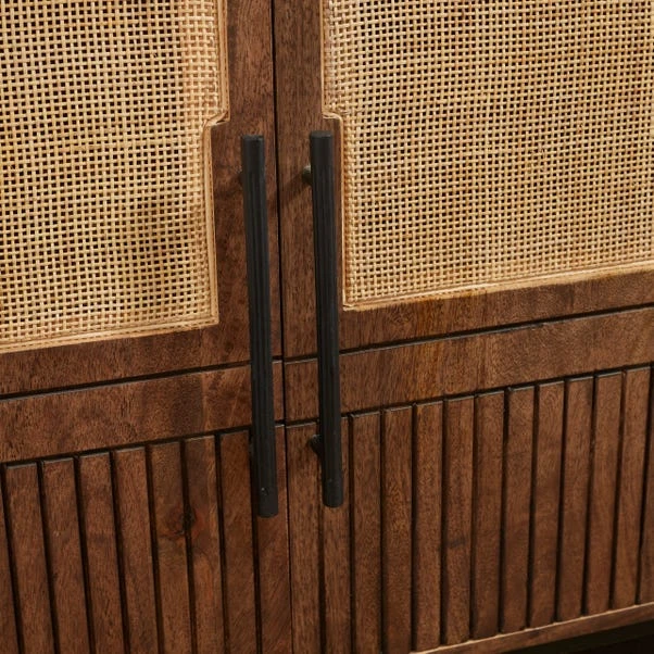Crafted from dark mango wood, this side board features black metal bar handles and legs for a modern touch. The four rattan and grooved detailed doors add to its global appeal. With two internal shelves, it offers ample storage space. Explore our range of living pieces to find matching items.