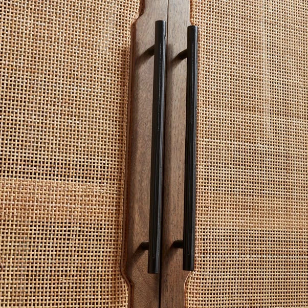 This wardrobe features black metal bar handles and legs, adding a sleek touch to the warm dark stain finish. The two rattan doors and grooved detail drawer enhance the global style aesthetic of the mango and cane range. Inside, a wooden hanging rail provides ample space for your clothes. Explore our bedroom pieces to find matching items and consider our living range for a coordinated look throughout your home.