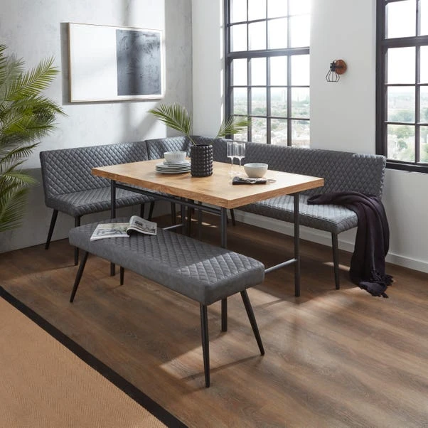 Designed to adapt effortlessly to your space, this seat can be configured to accommodate both left and right-hand arrangements, offering flexibility to suit your room layout. The exquisite diamond stitch detailing adds a touch of sophistication, elevating the aesthetics of your dining area or living space. This corner bench seat seamlessly integrates with other Montreal grey faux leather items, allowing you to create a cohesive and inviting ensemble. The supple faux leather upholstery not only exudes luxury but also ensures durability and easy maintenance, promising both comfort and longevity.