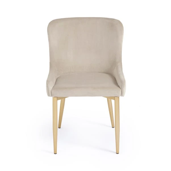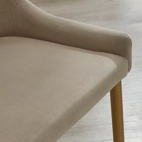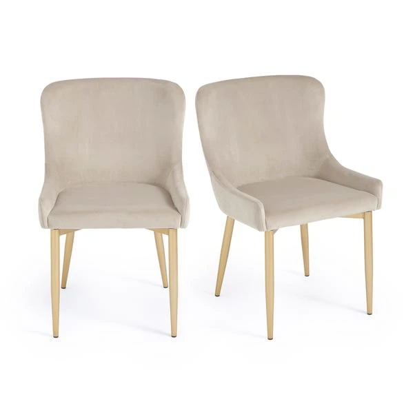 Indulge in opulence with these set of 2 dining chairs, designed to capture the attention of the glam-conscious customer. The luxurious mink colour of the velvet upholstery, combined with gold metal legs, creates a stunning visual contrast that adds a touch of glamour to your dining experience. With a curved backrest, these dining chairs offer comfort and support during meals and conversations. The stylish design and opulent materials are sure to impress your guests. Built with metal legs, these dining chairs ensure sturdiness and longevity, making them suitable for everyday use.