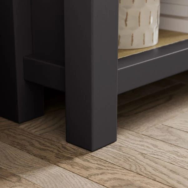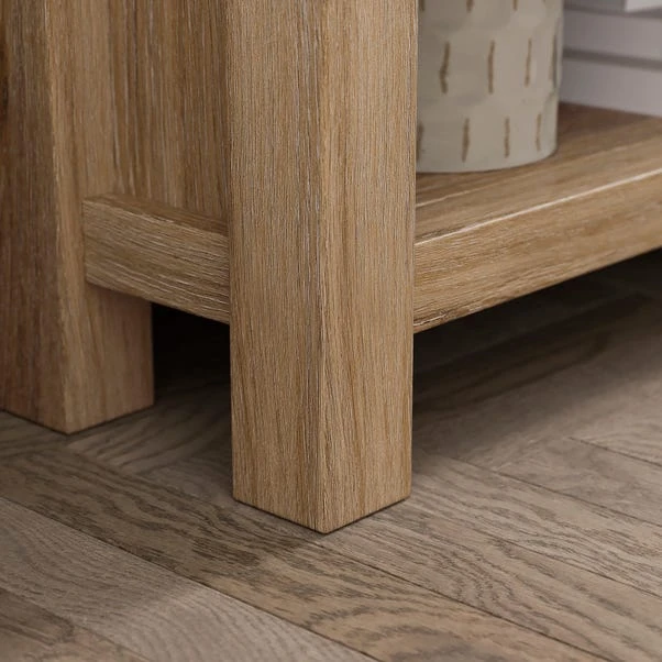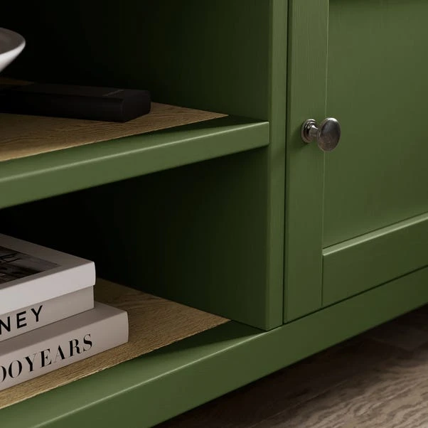 Get the perfect look for your living room with this stylish TV unit. With its oak effect finish, brushed metal brass handles and shelf and cupboard storage, you have everything you need to make entertaining a breeze.