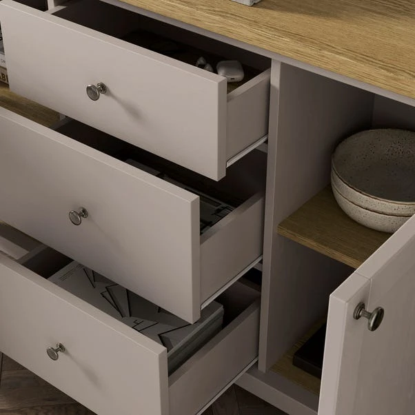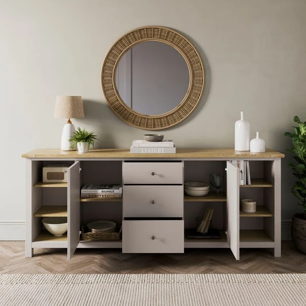 Make a bold statement with this extra-wide sideboard, packed full of storage options. With a mixture of cupboard, drawer and open shelf storage, you will be able to style this piece your way. Adjustable shelves give flexibility, whilst the cupboard doors allow you to store items out of sight. The open shelves are perfect for display, and the piece is finished in a modern stone colourway with wood effect shelves and top. The perfect addition to your living space.