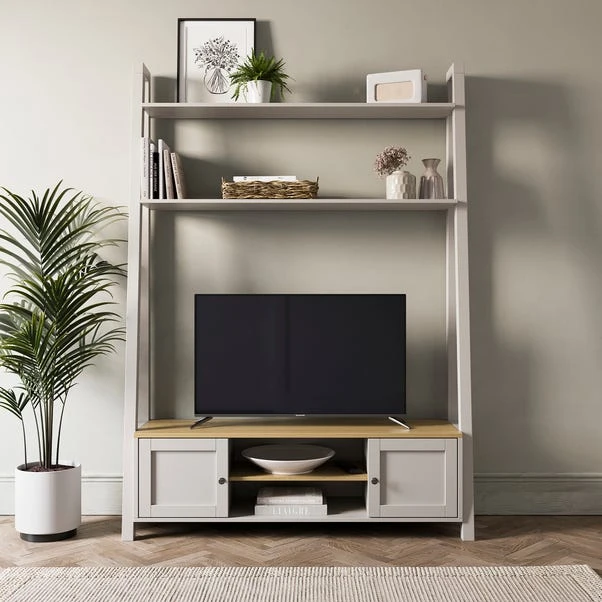 This TV units unique ladder-style structure not only adds a distinctive flair but also offers an eye-catching focal point for your living room. The open shelving provides versatile storage options for your media devices, gaming consoles, or cherished decor items. The Stone finish exudes sophistication, creating a neutral yet stylish palette that effortlessly harmonises with various interior design themes. Thoughtfully designed with cable management in mind, this TV unit ensures a tidy and organized entertainment setup.