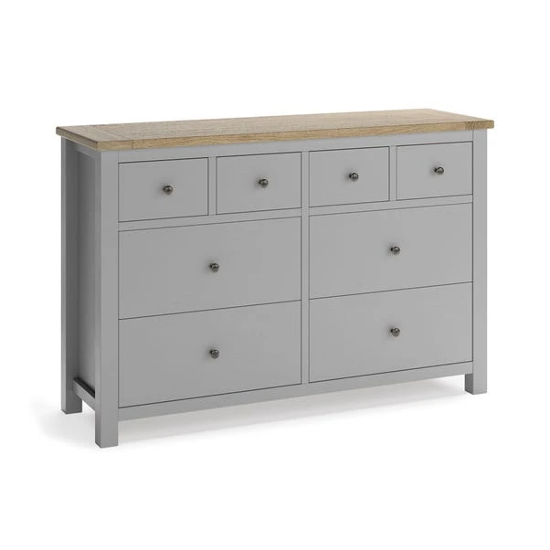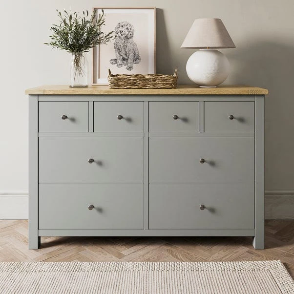 This exquisite chest of drawers is a testament to fine craftsmanship and thoughtful design, enhancing the aesthetics of any bedroom. Boasting a wide profile, it offers ample storage space across its eight drawers, providing a solution for keeping your space tidy and organised. The painted finish adds warmth to your decor, creating a welcoming atmosphere. Each drawer is thoughtfully designed with easy-glide functionality, making access to your belongings effortless. The spacious top surface allows for additional decor elements or serves as a functional space for your daily essentials.