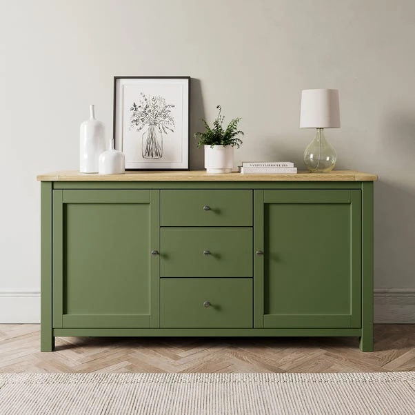 Give your dining room a fresh look with this oak effect sideboard. The unit features 2 doors and 3 drawers, offering plenty of space to keep things tidy as well as a lovely large storage space. The brass handles lend a traditional feel while ensuring it will fit in with your existing decor.
