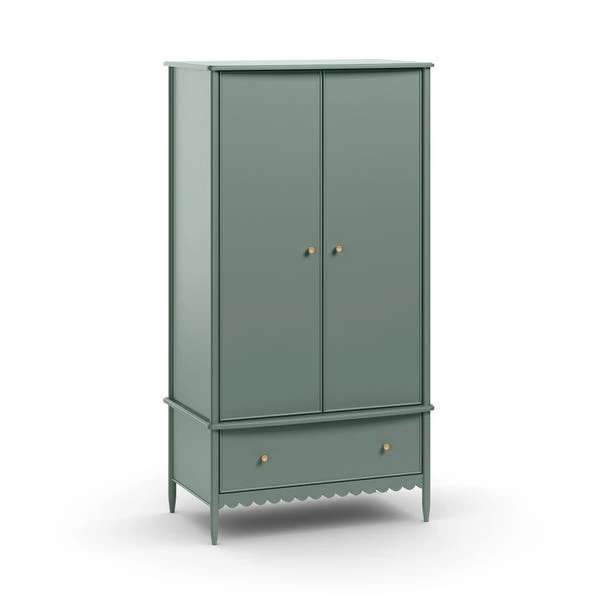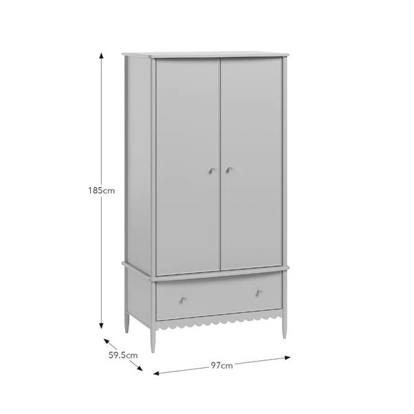 Discover the perfect blend of timeless design and functional storage and elevate the ambiance of your space with this exceptional piece of furniture. The double doors open to reveal ample hanging space, providing you with an organised and spacious storage solution for your clothing essentials. Say goodbye to cluttered closets and hello to a well-organized wardrobe! Hang your favourite garments with ease, ensuring they stay wrinkle-free and ready to wear whenever you desire. Not only does this wardrobe offer generous hanging space, but it also features a convenient drawer located below. This drawer is perfect for stashing away smaller items such as accessories, socks, or other personal belongings, allowing for a clutter-free and tidy space. The delicate scalloping details along the edges elevate its visual appeal. These subtle yet elegant accents lend a graceful touch to the overall design, making this wardrobe a statement piece in any room.