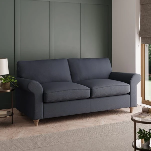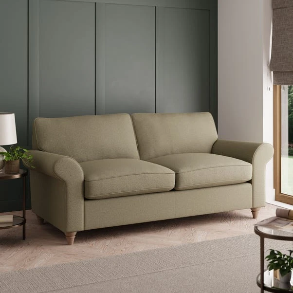 Designed with scrolled arms and turned wooden feet, the Rosa 3 Seater sofa offers an elegant, timeless style that would enhance any space. Finished in a choice of trendy colourways, this sofa is upholstered in a soft and versatile textured weave fabric, decorated with piped edge detailing for a smart finish. Featuring fibre filled seat cushion & back cushions and a sprung base, this sofa will also provide luxurious comfort.
