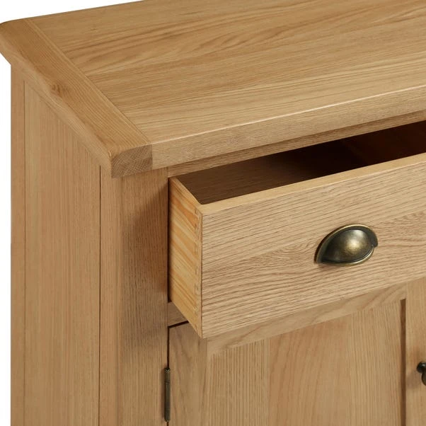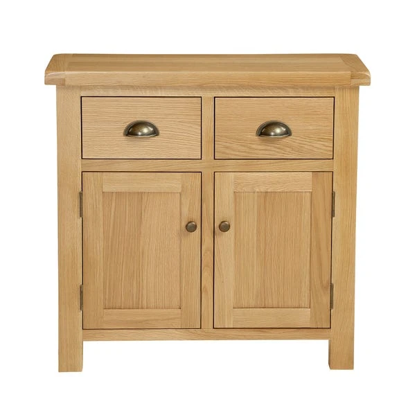 Featuring two spacious drawers made from pine wood and one cupboard equipped with a full length fixed shelf, this fully assembled mini sideboard is designed with solid oak edging on the legs and top surface and antique metal cup handles and doorknobs.