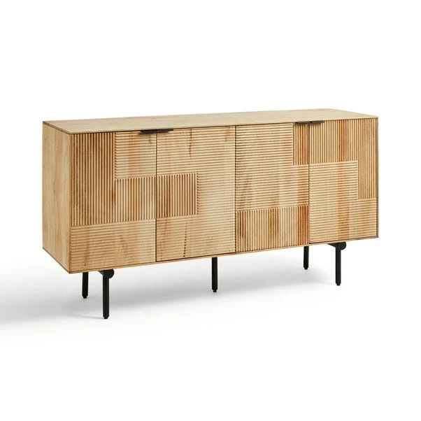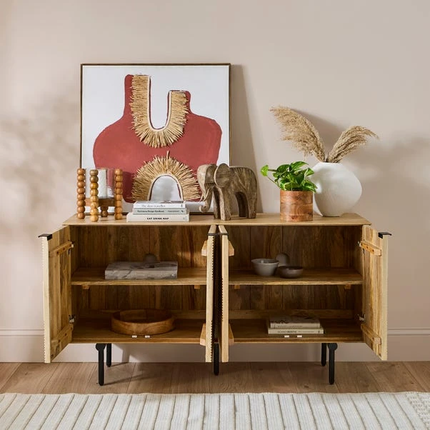 Crafted from high-quality mango wood, this sideboard features a natural wood finish that highlights the beautiful grain and texture of the wood. The spacious interior provides ample storage space, making it a practical addition to any dining room or living space. The wooden finish offers a versatile aesthetic that can complement various decor styles, from rustic to contemporary.