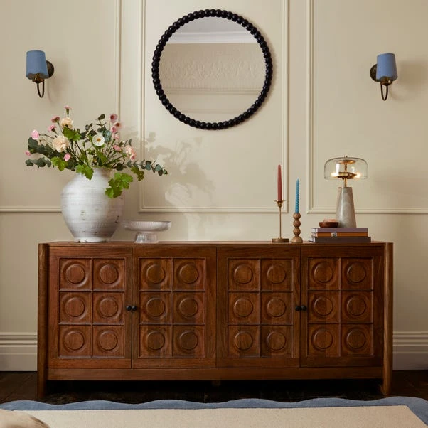 This stunning sideboard, fashioned from dark-stained mango wood, stands as a testament to both elegance and practicality. The rich, dark finish accentuates the natural beauty of the wood, while the detailing on the exterior showcases the brand’s dedication to creating a statement furniture item. The spacious interior provides ample room for organising your essentials, making it a functional yet visually striking addition to your living space.